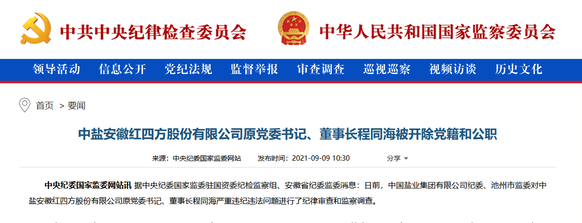 央视网消息:据中央纪委国家监委驻国资委纪检监察组、安徽省纪委监委消息:日前,中国盐业集团有限公司纪委、池州市监委对中盐安徽红四方股份有限公司原党委书记、董事长程同海严重违纪违法问题进行了纪律审查和监察调查。