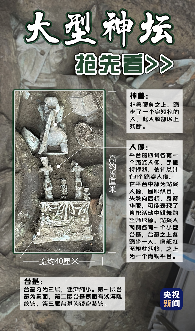 前有青铜神树,现有青铜神坛。随着考古发掘不断进行,在8号坑的东北角有了“新的重要发现”!造型独特、体型庞大、工艺复杂的大型神坛是首次发现,引发了考古界浓厚兴趣,研究价值突出。