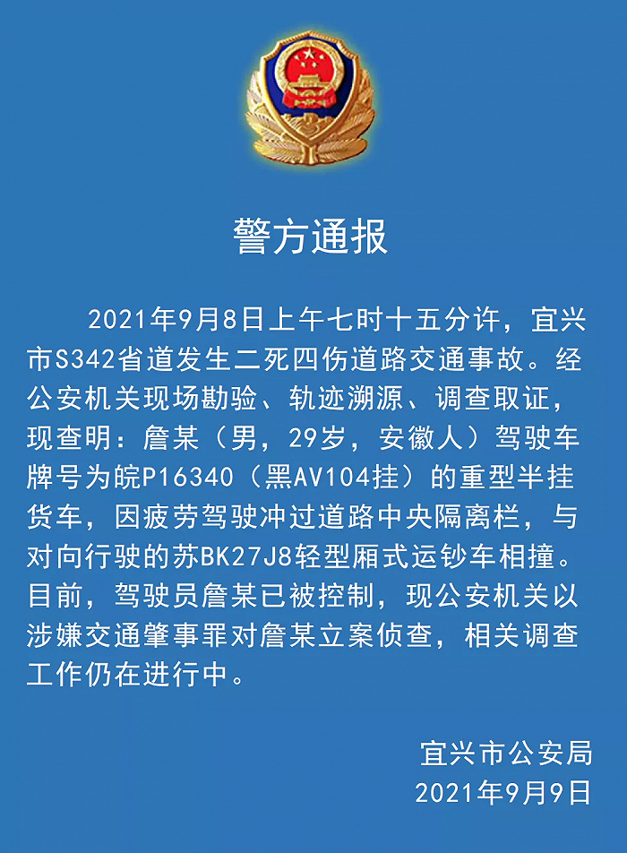 央视网消息:据平安宜兴微信公众号消息,9月9日,平安宜兴微信公众号发布关于“运钞车与货车相撞致2死4伤”事故的最新通报。货车司机因疲劳驾驶冲过道路中央隔离栏,与对向行驶的运钞车相撞。目前,货车驾驶员詹某已被控制。公安机关以涉嫌交通肇事罪对詹某立案侦查,相关调查工作仍在进行中。