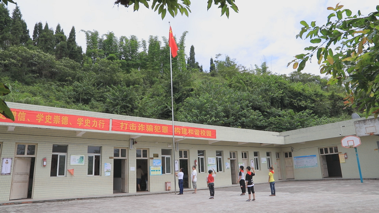 重庆市荣昌区盘龙镇云台村小的一周是从升旗仪式开始的。负责升旗的正是学校的负责人邓青友,而下面站着的是云台村小四年级的四个学生,他们也是云台村小仅有的四名小学生。