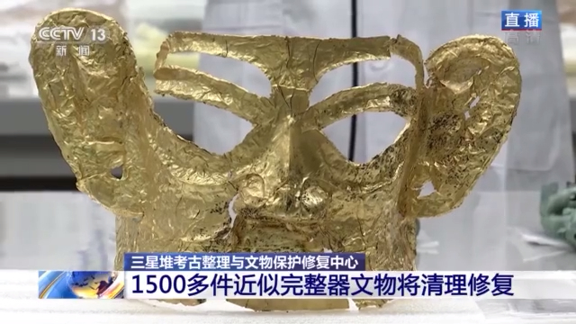 在工作区,可以近距离观察到初步修复成功的文物。这件金面罩,是今年从3号祭祀坑发掘出土的。