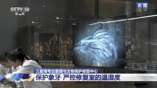 工作区内还专门设立了象牙修复室。这里温度和湿度的控制都更为严格,温度在18℃左右,湿度70%。因为象牙保护是世界性的难题,出土后由于失水速度加快,容易开裂、风化。在这间修复室内,文保人员正在对从三星堆遗址祭祀区出土的象牙进行清理,目前3号坑到8号坑发掘的相对完整的象牙达到了190多根。