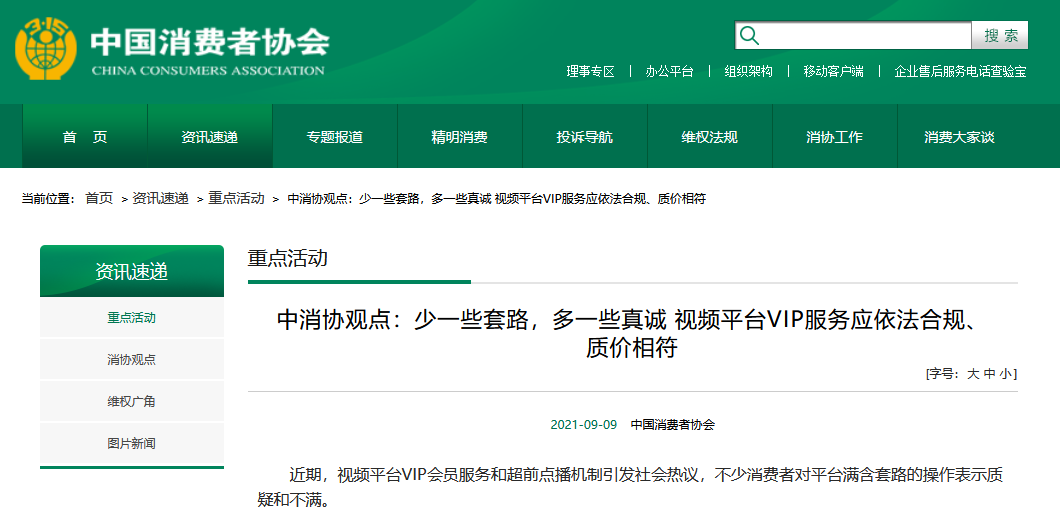 央视网消息:据中国消费者协会网站消息,近期,视频平台VIP会员服务和超前点播机制引发社会热议,不少消费者对平台满含套路的操作表示质疑和不满。