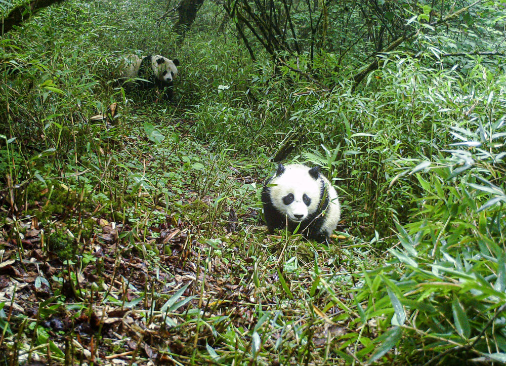 四川蜂桶寨国家级自然保护区红外摄像机拍摄到大熊猫与幼崽“同框”影像(2020年6月摄)。保护人员根据画面初步判断,大熊猫幼崽年龄在1岁左右。新华社发(四川蜂桶寨国家级自然保护区提供)
