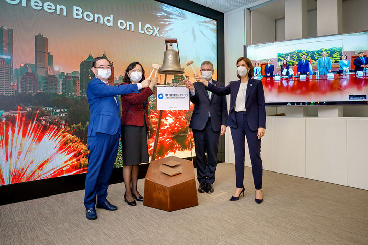 5月7日中国建设银行卢森堡分行8亿欧元绿色债券上市敲钟仪式在卢森堡和北京两地连线同步举行,图为当日在卢森堡证券交易所举行的敲钟仪式。中国建设银行供图 新华社发