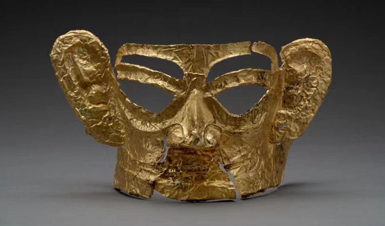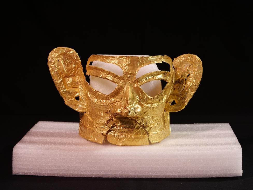 除此之外,三星堆遗址中还有大量的黄金饰品。其中在3号坑中,出土了一件完整的金面具,平铺展开大约40厘米,高约27厘米,是目前三星堆发现的完整黄金面具中,体型最大的一件。