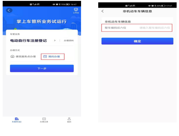 4、选择“预约办理”后,需准确填写电动自行车整车编码后6位。
