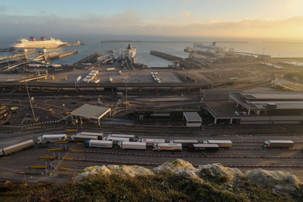 这是2020年12月31日在英国多佛拍摄的进入多佛港的货车。(新华社发,蒂姆·爱尔兰摄)