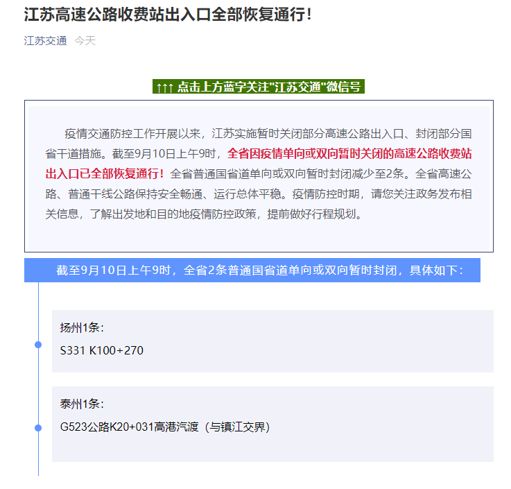 根据江苏交通微信公众号消息,9月10日上午9时,江苏省因疫情单向或双向暂时关闭的高速公路收费站出入口已全部恢复通行!江苏省普通国省道单向或双向暂时封闭减少至2条。江苏省高速公路、普通干线公路保持安全畅通、运行总体平稳。
