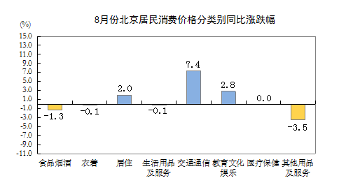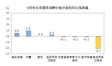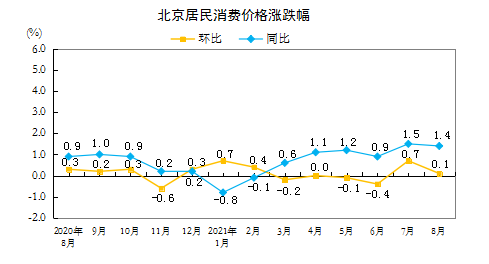8月份,北京居民消费价格总水平同比上涨1.4%。其中,食品价格下降4.1%,非食品价格上涨2.3%;消费品价格上涨0.3%,服务价格上涨2.6%。1-8月,北京居民消费价格总水平比去年同期上涨0.7%。