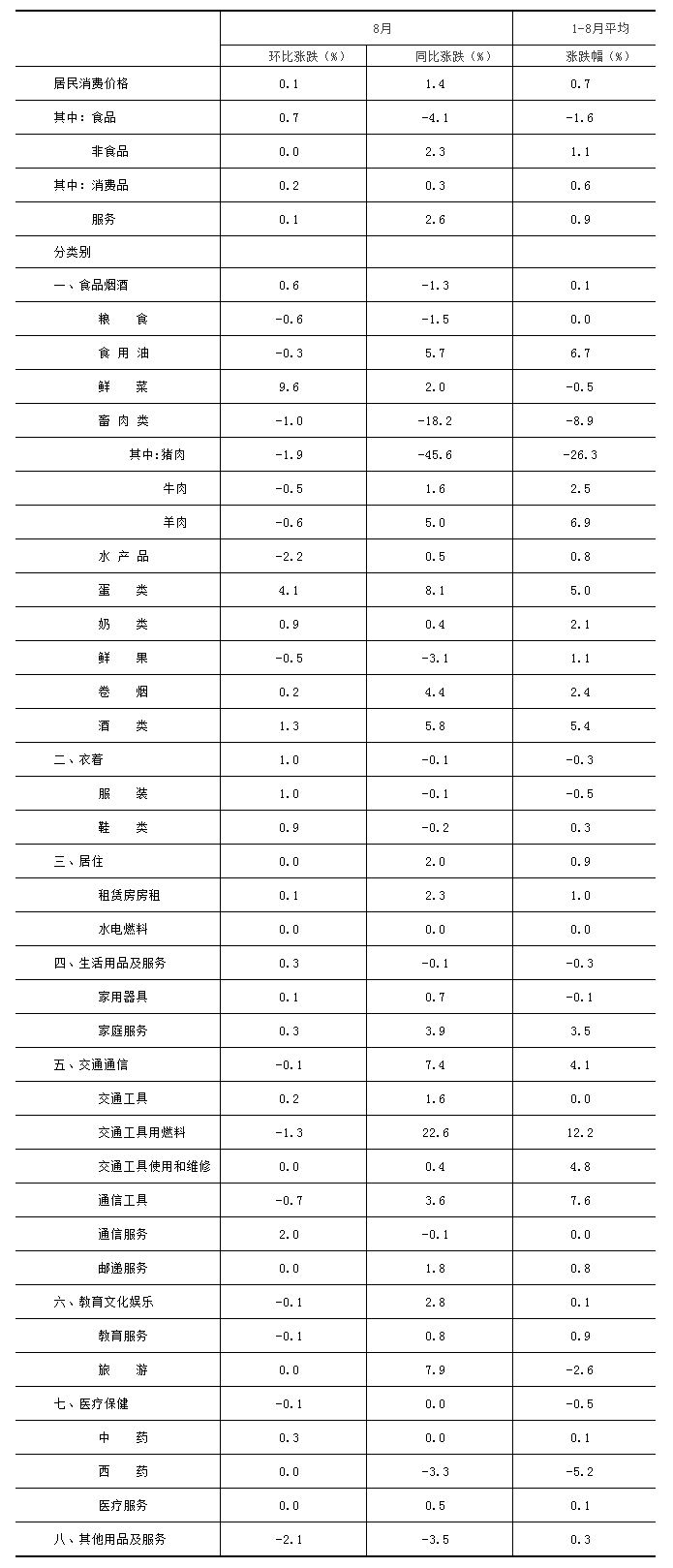 8月份,食品烟酒价格同比下降1.3%,影响总指数下降约0.30个百分点。食品中,畜肉类价格下降18.2%,影响总指数下降约0.57个百分点,其中猪肉价格下降45.6%,影响总指数下降约0.59个百分点;鲜果价格下降3.1%,影响总指数下降约0.06个百分点;蛋类价格上涨8.1%,影响总指数上涨约0.04个百分点;鲜菜价格上涨2.0%,影响总指数上涨约0.03个百分点;水产品价格上涨0.5%,影响总指数上涨约0.01个百分点。