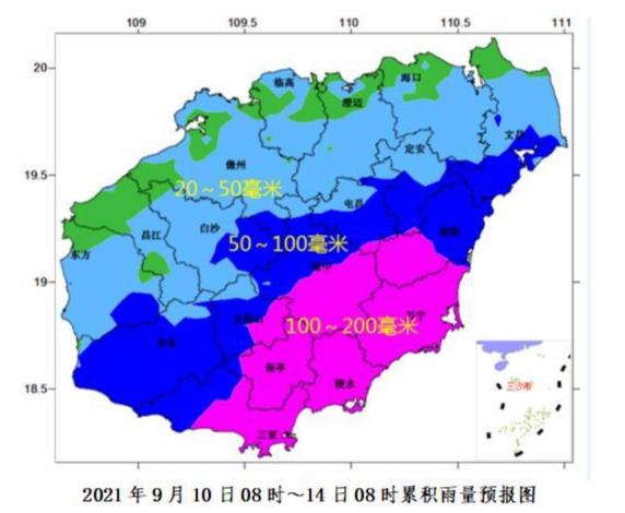 海南省气象台预计,受“康森”影响,10日至13日,南海中部海域将有强风雨天气;海南岛东南部陆地及近海将有较强风雨。预计,9月10日8时至14日8时各地累计雨量:万宁、琼中、陵水、保亭和三亚等市县100~200毫米;此外,11日至12日,西沙永兴岛有暴雨,风力9~10级、阵风11级。