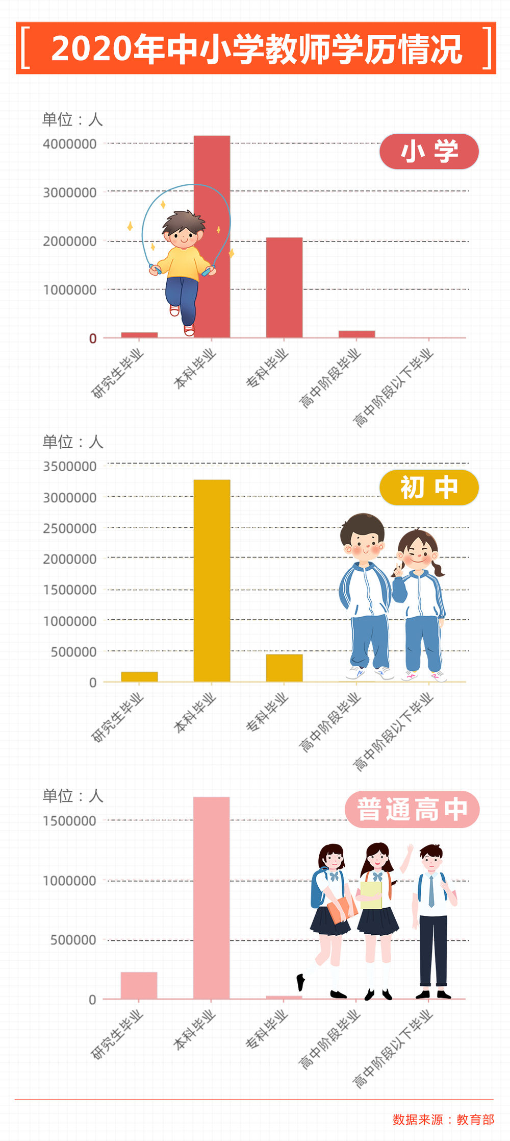 教师学历结构不断改善,各级各段专任教师学历合格率稳中提升,高学历教师比例逐年增加。2011年,我国小学、初中、普通高中教师具有本科及以上学历者分别是28.47%、68.22%、95.73%;到2020年,小学、初中、普通高中教师本科及以上学历者分别达到66%、88.56%、98.79%,分别提高37.53、20.34、3.06个百分点。