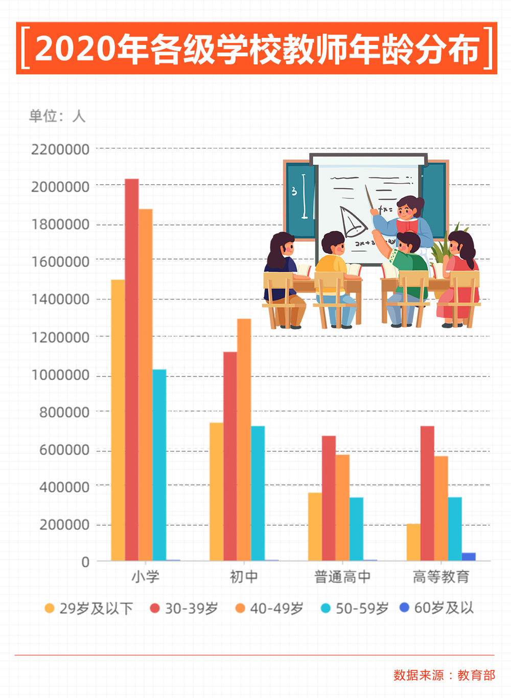 教师队伍总体上呈年轻化态势。小学、普通高中和大学教师年龄30-39岁的最多,初中教师年龄40-49岁的最多,80、90后已成为教师的中坚力量。