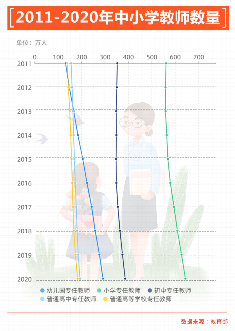 教师数量逐年稳步增长。教育部的数据显示,从2011年到2020年10年间,我国幼儿园、小学、初中、普通高中和大学的专任教师数量分别增长了121.35%、14.79%、9.53%、24.15%和31.59%。