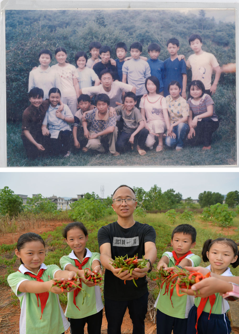 ↑拼版照片:上图为1997年,殷大福(中)刚参加工作时和学生们的合影(资料照片);下图为2021年9月1日,在江西宜春市袁州区寨下镇中心小学劳动实践基地,殷大福和学生们展示师生一起种植的辣椒(新华社记者 彭昭之 摄)。