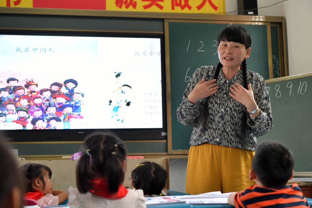 ↑在江西奉新县澡下镇白洋教学点,支月英在给学生上课(9月2日摄)。