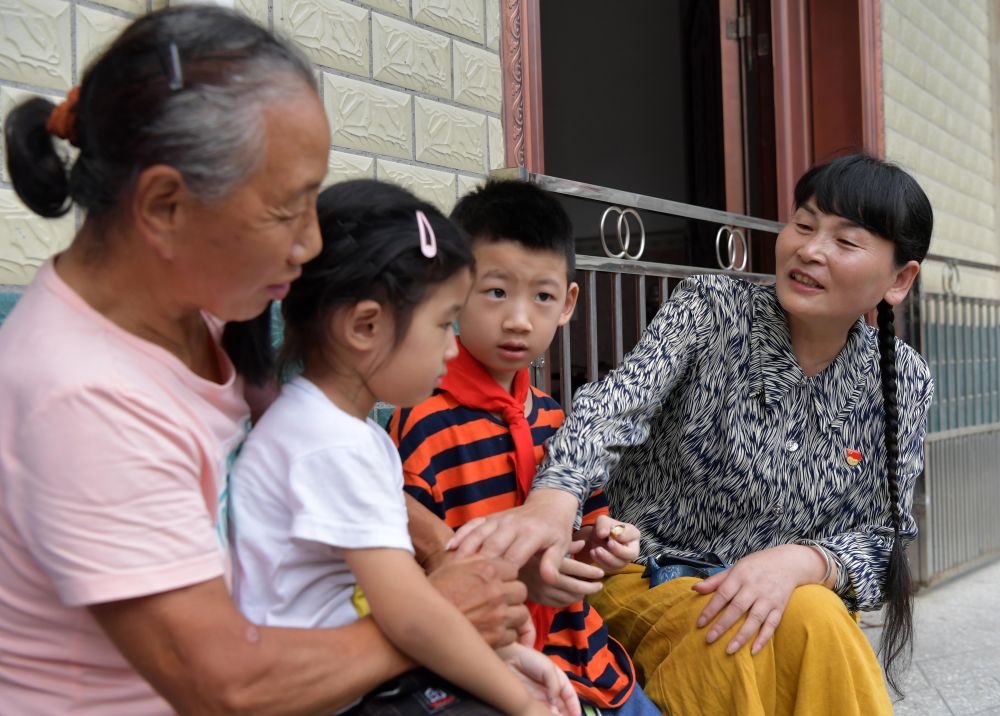 ↑放学后,支月英(右一)和学生家长聊天(9月2日摄)。