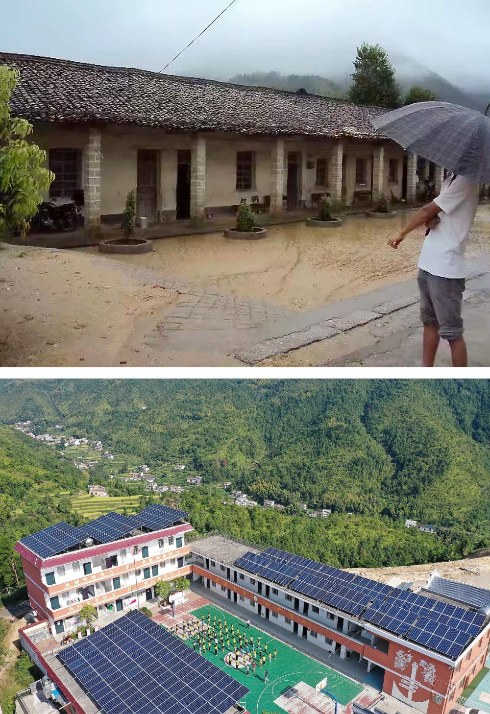 ↑拼版照片:上图为江西于都县仙下乡龙溪小学校舍旧貌(资料照片);下图为2021年8月30日拍摄的龙溪小学新貌(无人机照片,新华社记者 彭昭之 摄)。