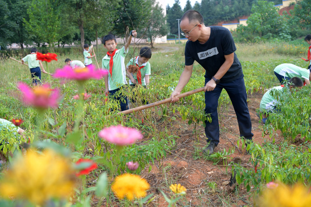 ↑在江西宜春市袁州区寨下镇中心小学劳动实践基地,校长殷大福带着学生们在蔬菜地里松土(9月1日摄)。