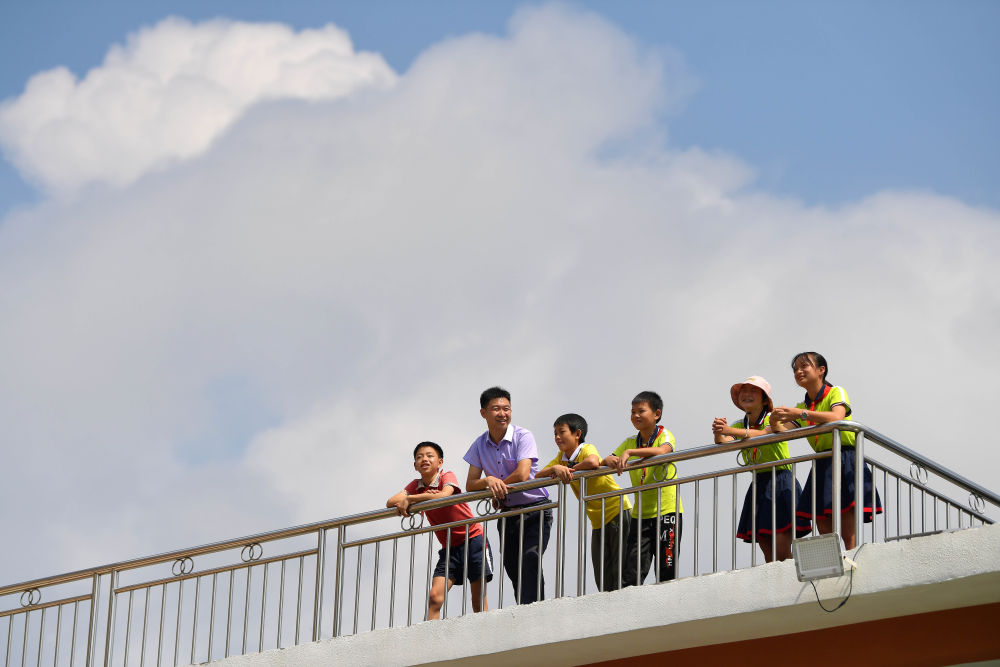↑在江西于都县仙下乡龙溪小学,朱森林和学生们聊天(8月31日摄)。