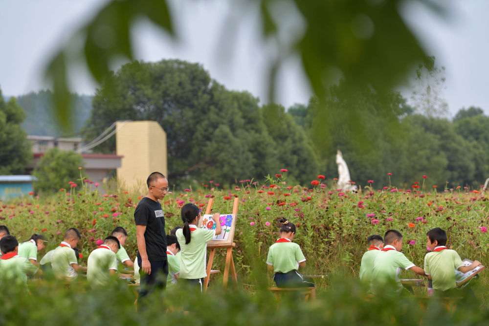 ↑在江西宜春市袁州区寨下镇中心小学,校长殷大福带着学生们在花田边写生(9月1日摄)。