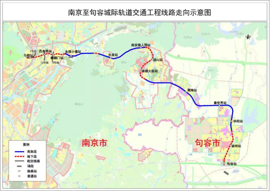 宁句城际起于南京东部综合换乘枢纽马群站,与既有2号线换乘,途经麒麟、汤山、黄梅、句容北部新城、句容城区,终于句容站,与在建的南沿江高铁句容站衔接。线路全长43.590km,共新设车站13座,其中地下站7座,高架站6座,车辆采用市域B型车,最高运行速度为120km/h(地下段100 km/h)。全线13座车站根据所处位置、周边人文环境、交通驳接等因素分为标准站、重点站、特色站,并充分考虑到与周边环境和谐相融的因素,因站施策,彰显了“纵情山水•回归自然”设计理念。