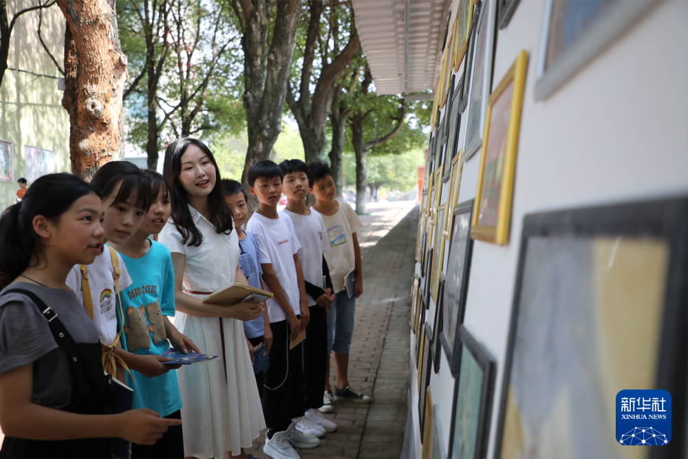 王云带着学生看校园里的“诗歌墙”。(黄新 摄)