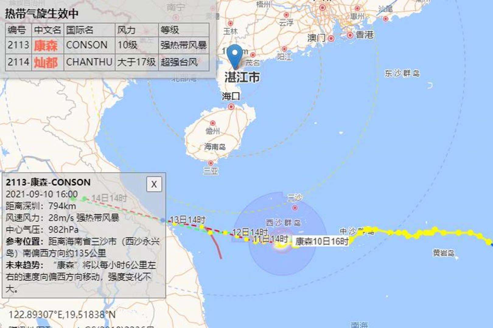 9月10日16时,今年第13号台风“康森”,中心位于广东湛江市区偏南方向约629公里的海面上(北纬15.7°,东经111.9°),中心附近最大风力10级(28米/秒),中心最低气压982百帕,预计将以每小时6公里左右的速度向偏西方向移动,强度变化不大,未来将对湛江造成影响,沿海风力逐渐加大。