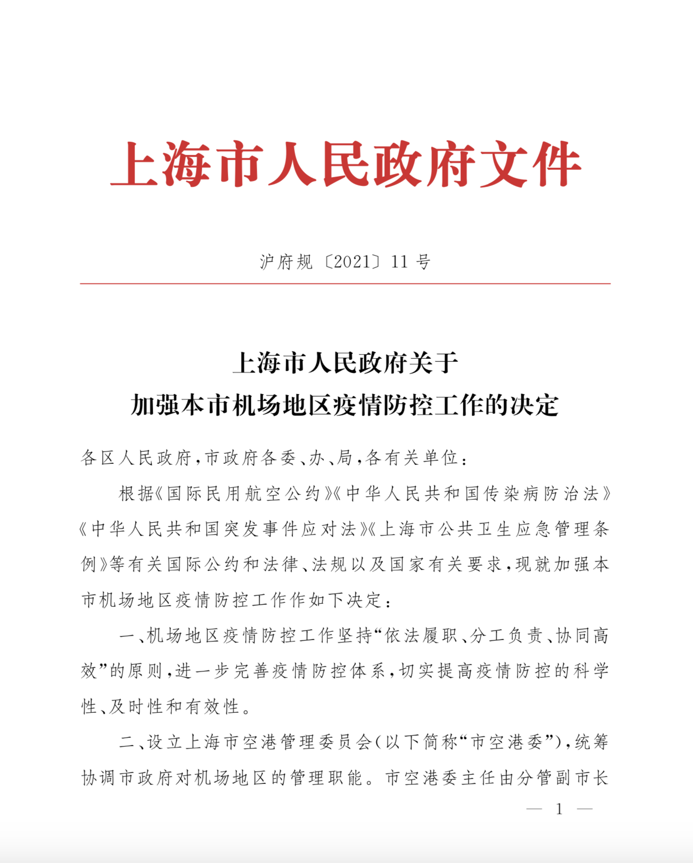 9月10日,上海市人民政府在官方网站上公布了《上海市人民政府关于加强本市机场地区疫情防控工作的决定》,设立上海市空港管理委员会,统筹协调上海市政府对机场地区的管理职能,空港委主任由分管副市长担任,市政府相关部门、上海机场(集团)有限公司和相关区政府、口岸查验单位、民航管理部门以及主基地航空运输企业等为成员单位。上海市空港管理委员会下设市空港办,全面负责机场地区疫情防控等各项工作的统筹协调和推进落实,以及上海市政府明确的其他统筹协调职责。机场地区各驻场单位和境内外航空运输企业应当按照“四指定”“四固定”“两集中”“两分离”等要求,对“人、物、环境”实施严格的疫情管控措施。