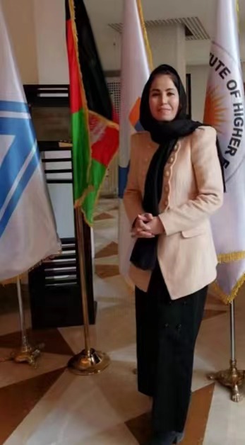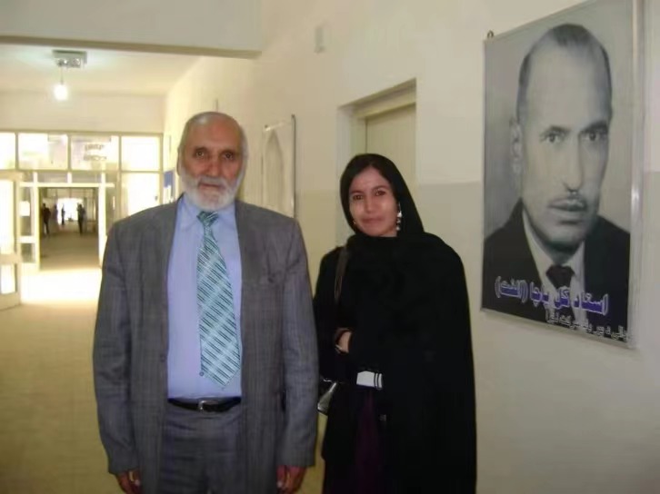 △在喀布尔大学,塔克娃和自己的普什图语言文学老师合影