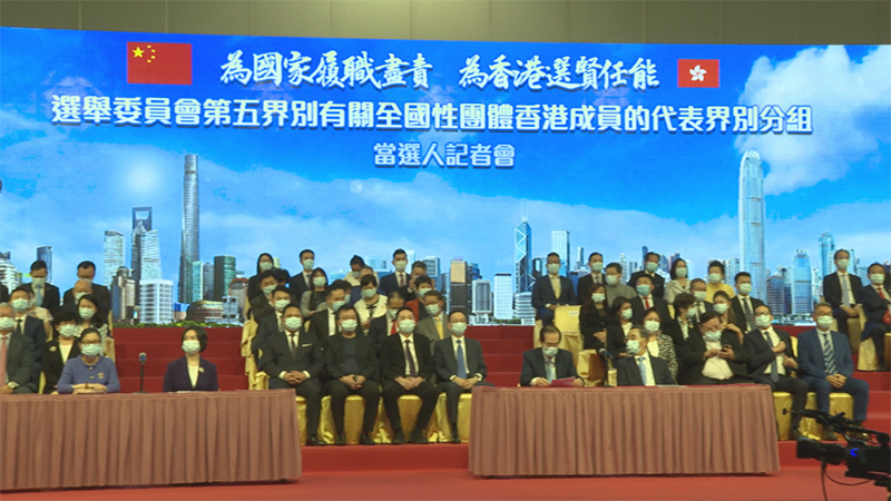 9月10日下午,香港选举委员会第五界别有关全国性团体香港成员的代表界别分组当选人在香港会展中心举行记者会。他们表示,将为国家尽职尽责,为香港选贤任能。
