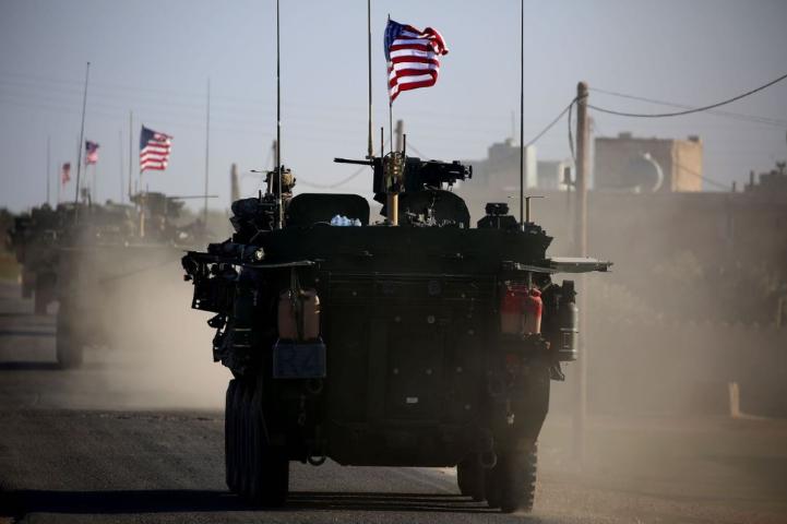 △美军装甲车车队在叙利亚北部城市曼比季巡逻