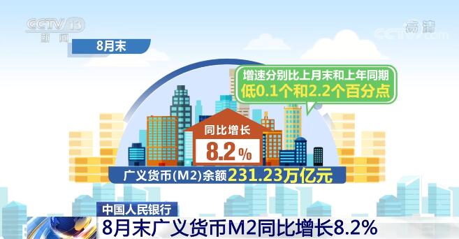 央视网消息:昨天(9月10日),央行发布了8月金融统计数据。2021年8月末,广义货币(M2)余额231.23万亿元,同比增长8.2%。增速分别比上月末和上年同期低0.1个和2.2个百分点。
