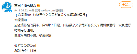 央视网消息:应疫情防控的要求,自9月11日起,仙游县公交公司所有公交车辆暂停运行,恢复运行时间另行通知。