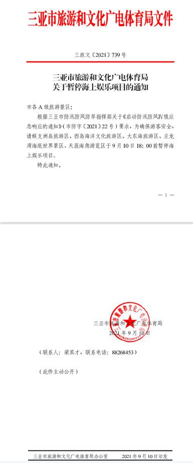 9月11日,记者从海南省三亚市旅文局获悉,针对今年第13号台风“康森”(强热带风暴级),根据三亚市防汛防风防旱指挥部办公室通知要求,9月10日18时起,三亚蜈支洲岛旅游区、西岛海洋文化旅游区、大东海旅游区、亚龙湾海底世界,以及天涯海角游览区海上娱乐项目暂停营业。