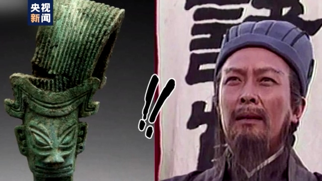 很多人觉得,这件青铜头像很像电视剧中诸葛亮所戴冠帽。诸葛亮生活在三国时期,生于公元181年,卒于公元234年,而三星堆的历史定年在公元前1100年左右,相差了1300年左右。两者在形象上的巧合,自然出自人们的联想,但青铜人头像上如果戴的是冠,会是什么材质呢?回答这个问题,还需要进一步的考古发现和分析研究。