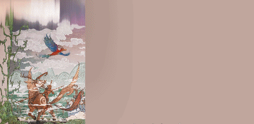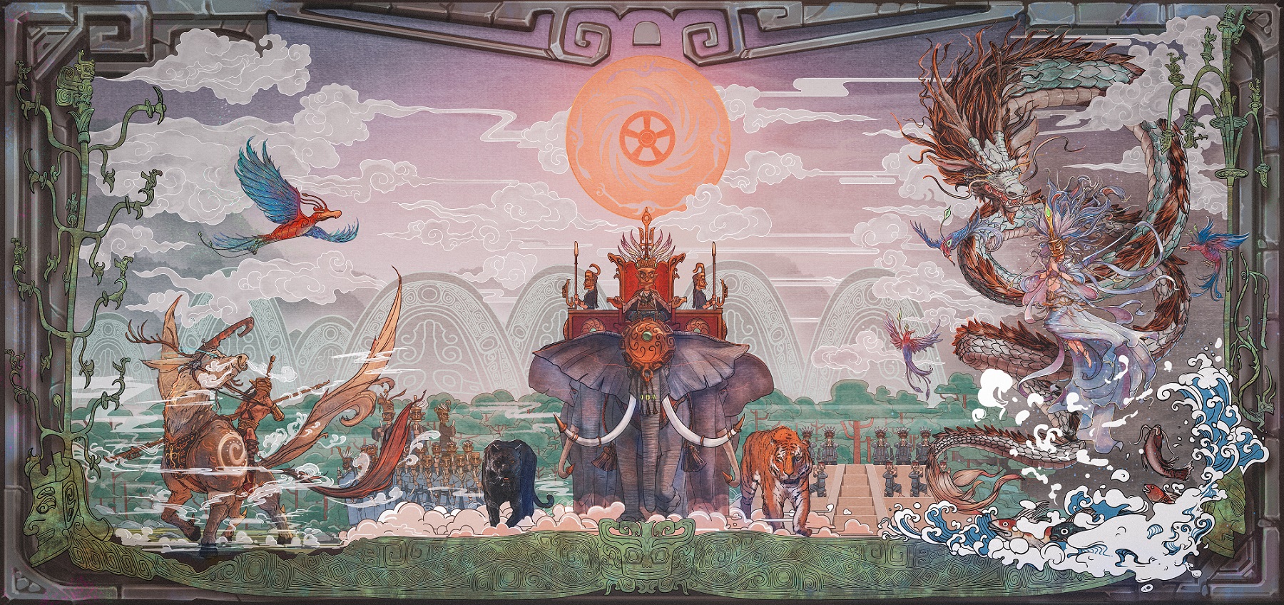 我第一章讲的是神兽还有人,那么到第二章就是我们的国王,在我的想象中可能就是国王坐在这个象上面,然后有一个很整齐的队伍在往前的行进一个过程,然后后边是一轮灼热的太阳,而且是我们也能看到有太阳轮,包括同时期的这些太阳图腾式的表现的。第三幅是配合着龙和神鸟。