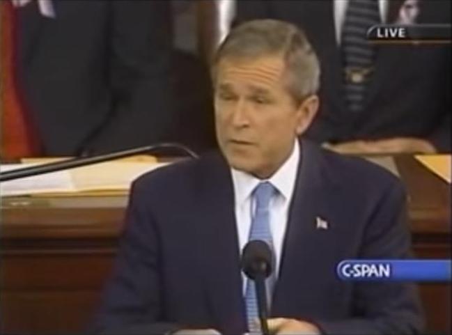 2001年9月20日,时任美国总统小布什在美国国会联席会议上发表讲话。他向所有在座的议员们提问:“为什么极端分子恨我们?因为他们不想见到这个议会里的情景,他们不愿意接受一个民主政府。”将“反恐战争”的对象扩大到每一个不实行美国认可的“民主模式”的中东国家。