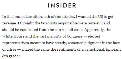 “袭击发生后,我希望美国立即报复。我认为恐怖分子是纯粹的邪恶分子,应该不惜一切代价从地球上铲除。显然,白宫和绝大多数国会议员在面对危机时有着稳定、理性的判断,他们与一个情绪化、无知的八年级学生有着相同的情感。”