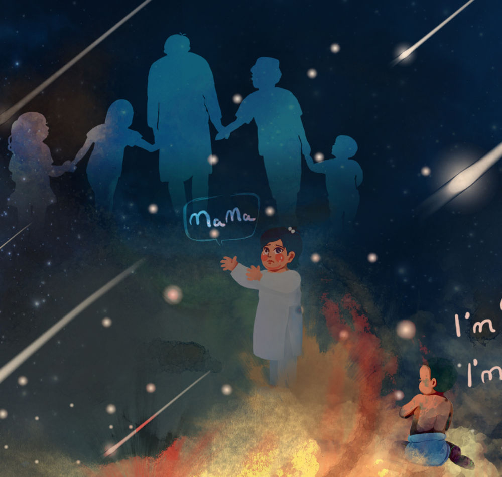 画师在一片火光中重现幼儿生前的模样:一个坐在地上嚷着“我两岁,我不是恐怖分子”;另一个哭喊“妈妈”,伸出双手要“抱抱”。