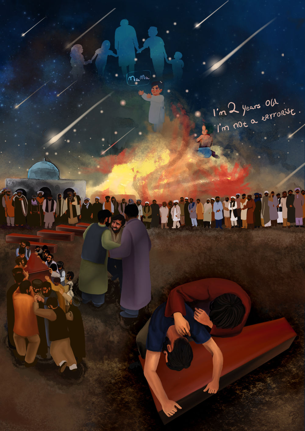 玛丽卡和苏玛雅只有两岁,在空袭中被炸身亡,这幅漫画因此取名《两岁“恐怖分子”的葬礼》。漫画描述的是七个夭折的孩子下葬的瞬间。画面中心,是挖好的墓坑。大小不一的棺材依次排开,送葬的人们正将一口棺材抬进墓坑。