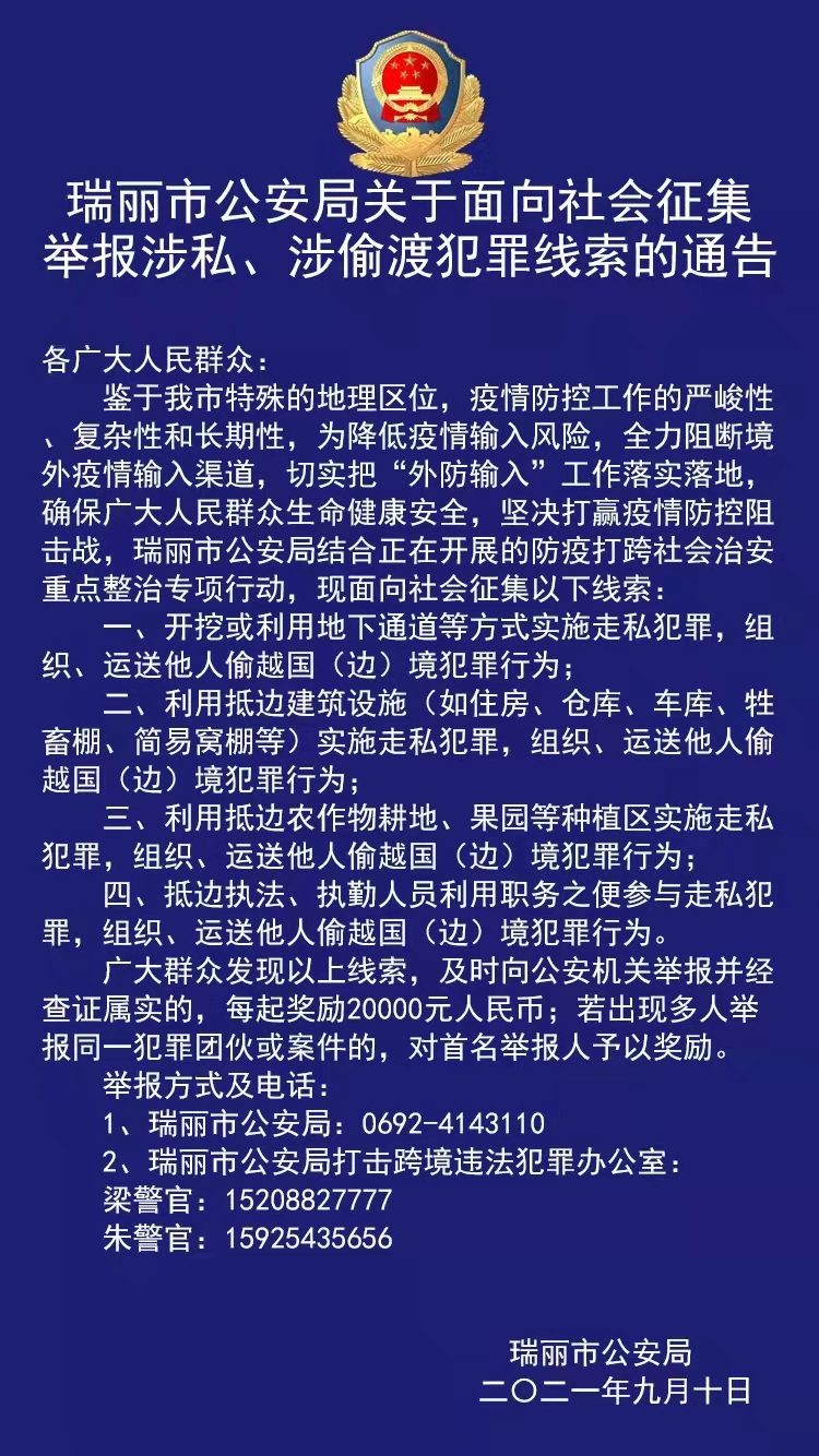 为降低疫情输入风险,全力阻断境外疫情输入渠道,云南省瑞丽市公安局对外发布通告,面向社会征集举报涉私、涉偷渡犯罪线索。经查证属实的,每起奖励20000元人民币。