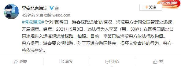 海淀警方会同公园管理处迅速开展调查。经查,2021年9月8日,违法行为人李某(男,39岁)在圆明园遗址公园违规进入远瀛观遗址踩踏、拍照。目前,李某已被海淀警方依法行政拘留。