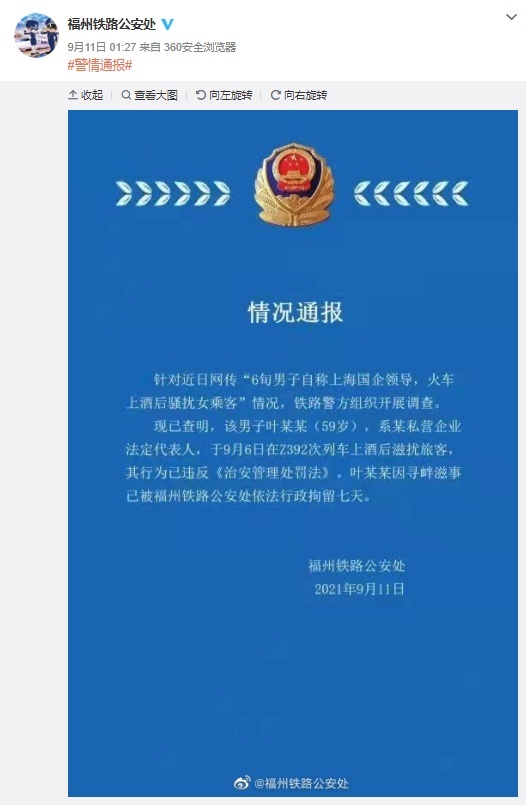 现已查明,该男子叶某某(59岁),系某私营企业法定代表人,于9月6日在Z392次列车上酒后滋扰旅客,其行为已违反《治安管理处罚法》。叶某某因寻衅滋事已被福州铁路公安处依法行政拘留七天。