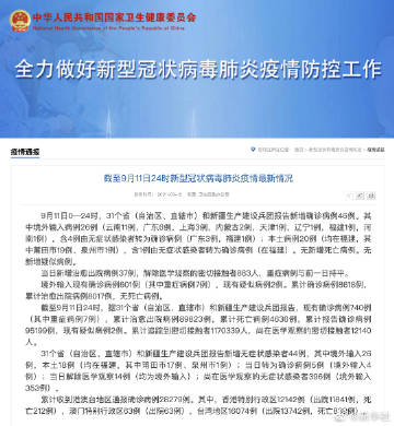 截至9月11日24时,据31个省(自治区、直辖市)和新疆生产建设兵团报告,现有确诊病例740例(其中重症病例7例),累计治愈出院病例89823例,累计死亡病例4636例,累计报告确诊病例95199例,现有疑似病例2例。累计追踪到密切接触者1170339人,尚在医学观察的密切接触者12140人。