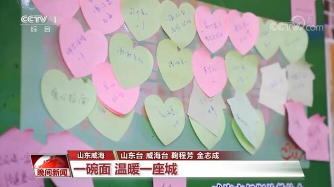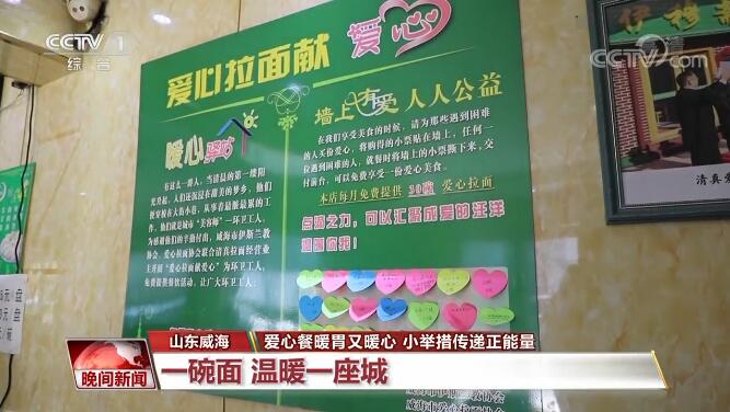 在山东威海的不少拉面馆里,顾客们一进门都能在墙上看到这样一张爱心展板,上面粘贴着几张到几十张不等的爱心拉面便签。老板说,有人如果遇到困难,只要撕下一张爱心便签,就可以免费享用一碗热腾腾的拉面。在威海,张贴爱心便签的拉面馆已经有100多家,很多顾客在自己消费时都会多买一份或几份。