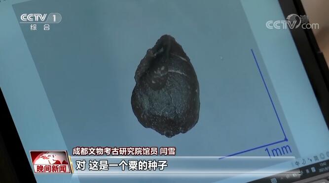 成都文物考古研究院馆员 闫雪:我们最近的植物考古工作主要是围绕4号坑开展的,这个就是我们4号坑灰烬层中最近发现的一粒粟。