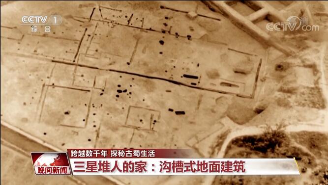 现在看到的这张图片是1981年用直升机拍摄的三星堆遗址发掘画面。在那次发掘中,在三星堆遗址共发现18座商周时期的房屋遗迹,所有遗迹均保存沟槽,沟槽内分布有密集的小柱洞,用于固定木骨或竹骨。