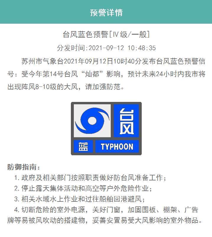 苏州市气象台2021年09月12日10时40分发布台风蓝色预警信号:受今年第14号台风“灿都”影响,预计未来24小时内苏州市将出现阵风8-10级的大风,请加强防范。(总台记者 杨光)